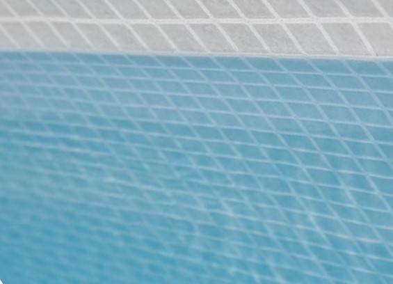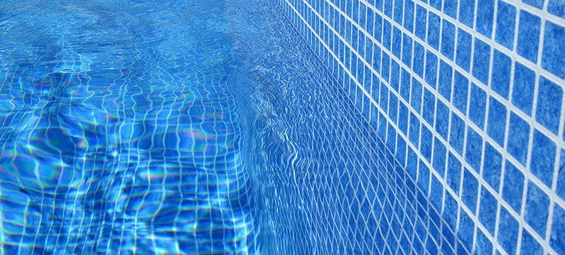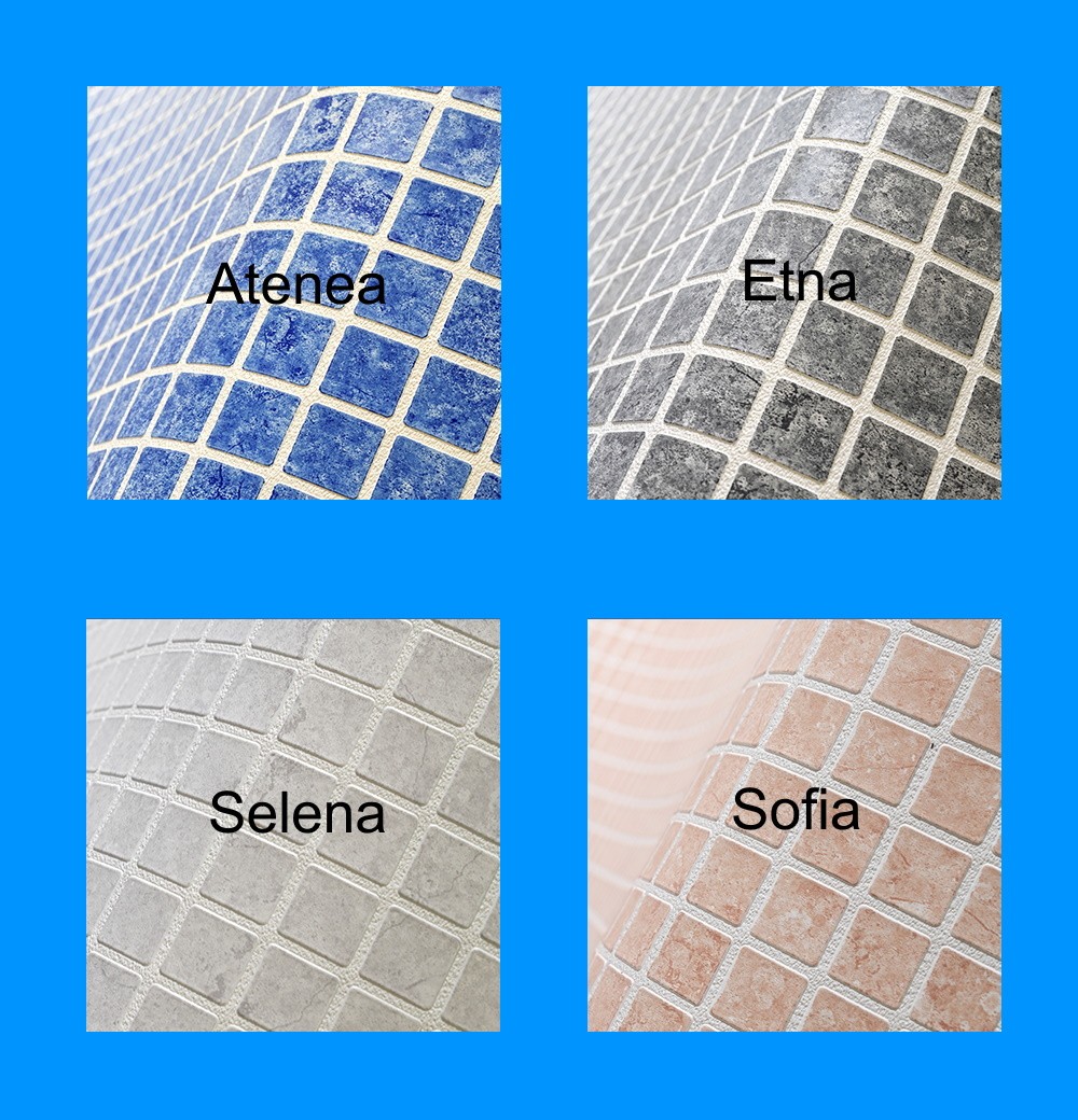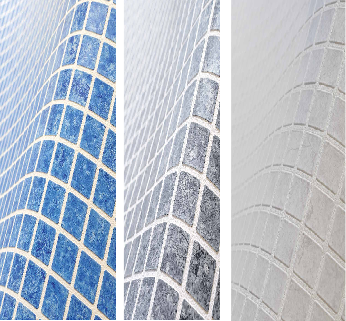 CERAMICS é uma membrana reforçada de 2 mm em relevo para piscinas que imita o efeito de uma piscina em pastilhas de vidrol e das suas juntas para parecer um mosaico inspirado na mitologia grega.